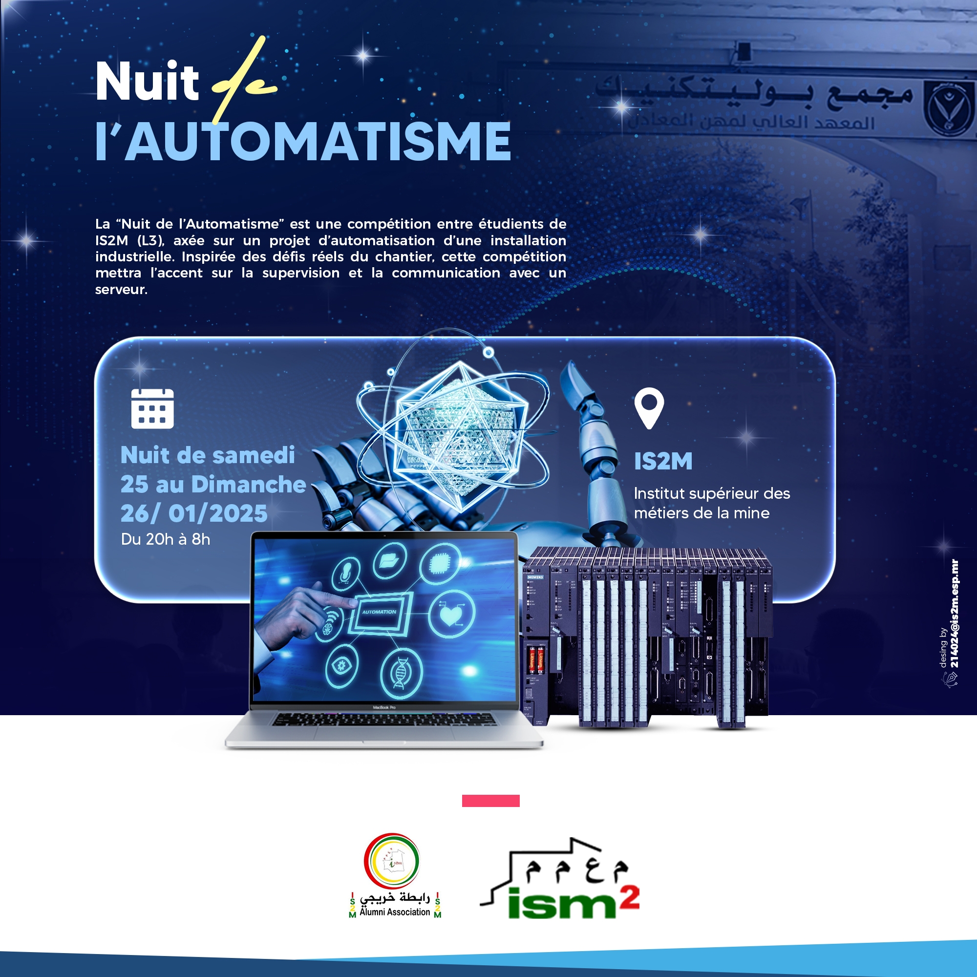 L’Association des diplômés de l’Institut Supérieur des Métiers de la Mine organise une nuit compétitive entre les étudiants de troisième année, spécialité Diagnostic et Maintenance des Systèmes Automatisés. Cet événement vise à développer les compétences des étudiants en leur attribuant un projet intégré à réaliser tout au long de la nuit.